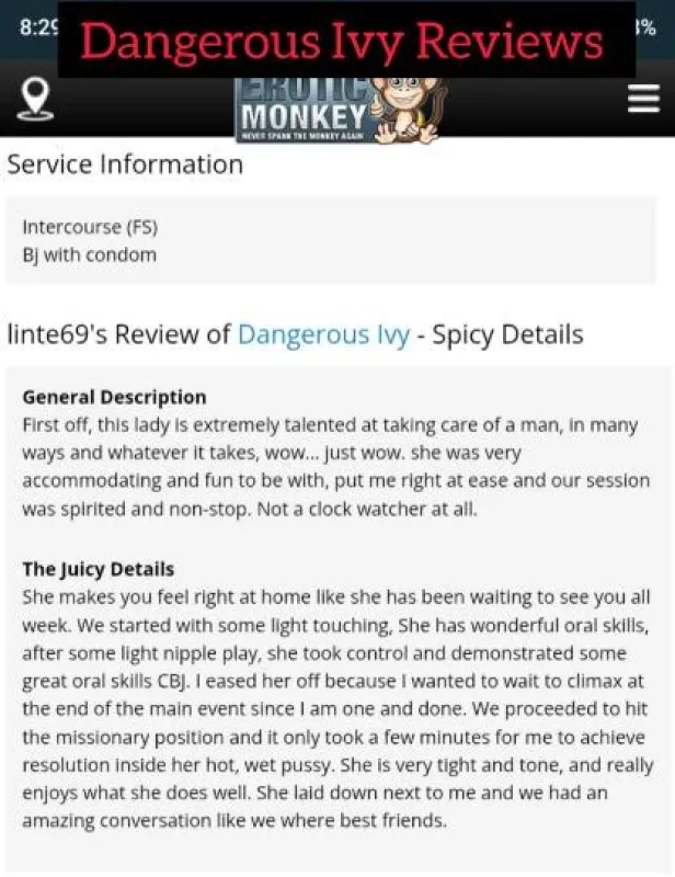 Hello gentleman, I'm Dangerous Ivy I specialize in fetishes GFE (BBJ, SQUIRTING,NURU MASSAGE, FACIALS)and the SENSUAL massages with a full menu to offer. Massage included in HHR+ I'm always in heels and lingerie ❤. I do not serve gentlemen under 30! My hygeine is A+ and yours should be as well. If not, please request cleaning supplies, I have them for you. 💦 HEAVY SQUIRTER💦 GREEK AVAILABLE ! FREAKY 🎥 50+ videos ❌️NO PPV❌️ SUBSCRIBE HERE! 👉🏿 ONLYFANS.COM/DANGIVY *FOLLOW ME HERE⬇* VERIFIED AND REVIEWED EM ID:400690 Twitter/X: @dangivy2 *OUTCALLS REQUIRES A $50DEPOSIT* Giftcard or Bitcoin ONLY